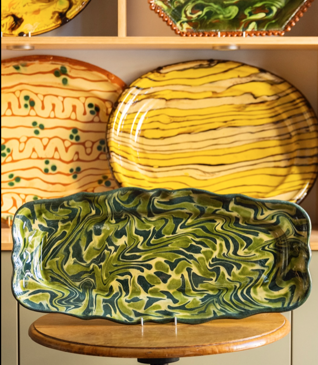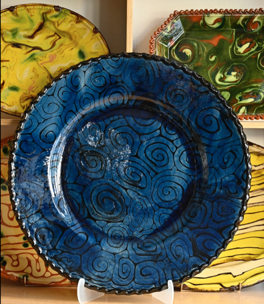 Avec les engobes teintés aux oxydes métalliques, on peut s’amuser à les projeter sur la terre de différentes manières. On appelle cela les jaspés, car ils ressemblent à la pierre que l’on appelle jaspe. Cela se réalise en un tour de main, sans traîner. C’est parfois sublime, surprenant, très dynamique, parfois pas du tout et ce n’est que du « vomi de chien » bon pour la poubelle!